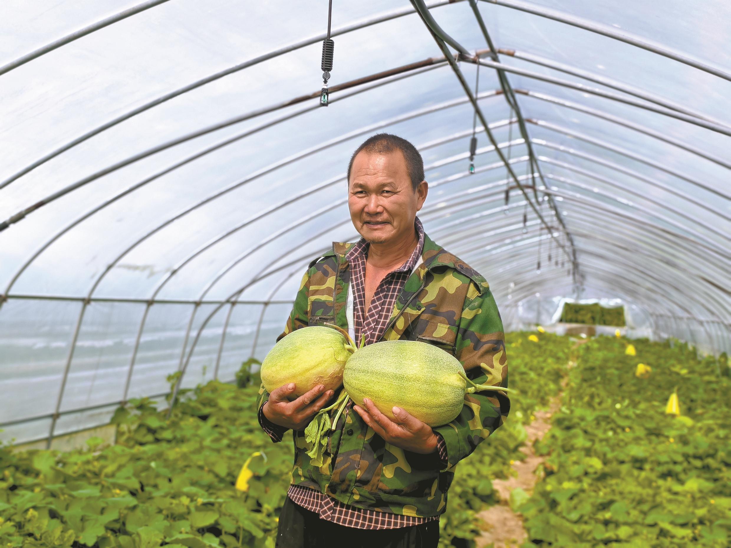屠建光双手抱瓜,图右侧是甜瓜王。(戎美容 摄)