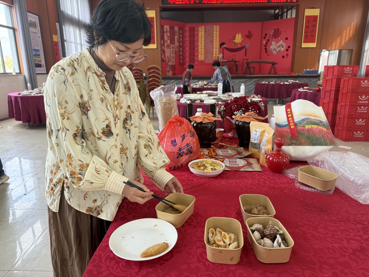 婚礼现场一角,一个精心布置的“塘溪特产小集市”成为最具人气的区域。这里没有商业礼品,摆放的是塘溪本地的笋干、梅干菜、土鸡蛋、手工年糕等农特产品以及各类手写对联、文创产品等。这些带着泥土芬芳和文化底蕴的“宝贝”,既是招待远方来宾的诚意,也是向外推介家乡的窗口。
