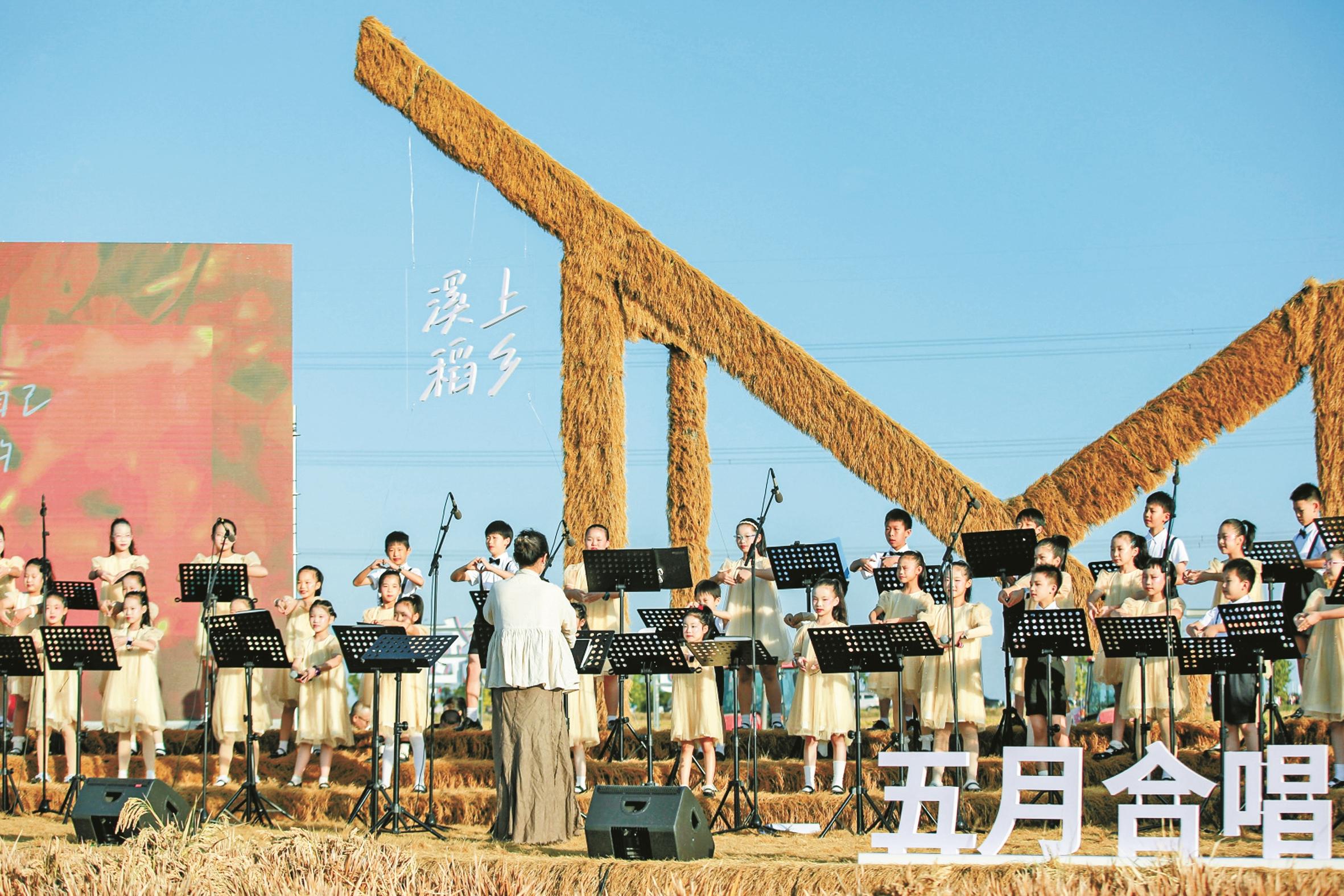 金秋十月,慈溪附海镇“溪上稻乡”千亩稻田翻滚着金色的波浪。近日,一场落日音乐会在一片收割完成的稻田上举行。