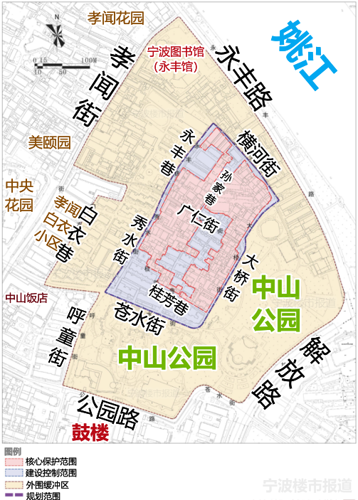 秀水街历史文化街区保护范围图(据《宁波市秀水街历史文化街区保护规划》标绘)。