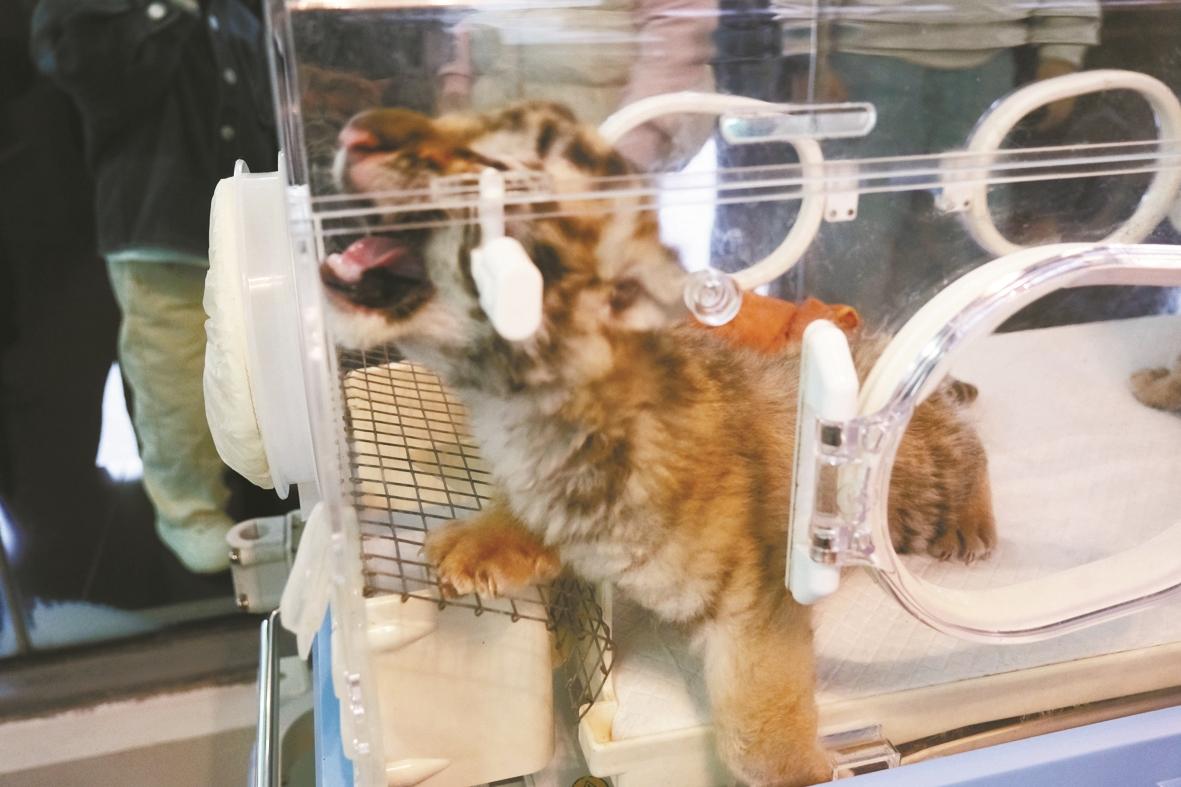 10月26日上午,记者走进“动物幼儿园”,立刻被保温箱内的小家伙们吸引。两只东北虎幼崽活力满满,见到保育员靠近,便在箱内不停躁动,发出类似小猫的软糯叫声,还争相把头探出保温箱小门,迫不及待想要探索新世界,被保育员温柔送回后仍不甘示弱地扒着箱边。