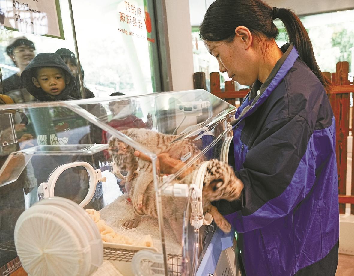 为了照顾好这四个“小宝贝”,由70后大妈、80后辣妈以及90后、00后小姑娘组成的育幼团队,开启24小时轮班值守模式。“比照顾自家孩子还操心!”保育员石迪迪笑着说,她们每隔一段时间就会查看保温箱温度,根据幼崽状态精准调节,及时补充营养。不仅如此,前期还需模拟母虎舔舐行为,用温热毛巾帮助幼崽排便,全程细致记录成长数据,用专业与爱心弥补它们缺失的母爱。