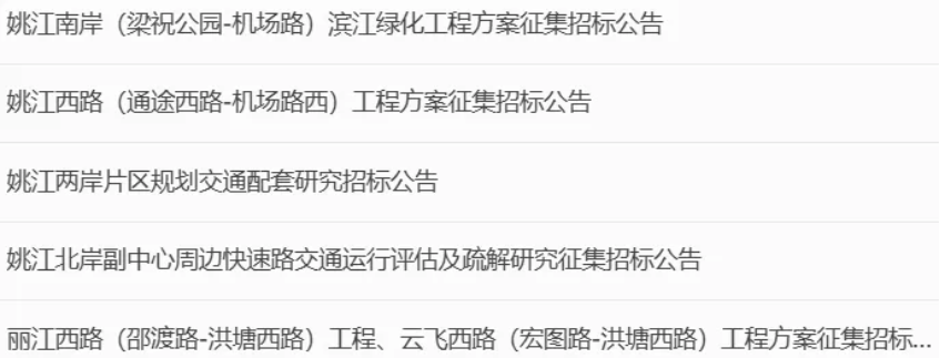 宁波市阳光采购服务平台昨天发布多则与姚江两岸后续建设相关的招标公告,涉及滨江绿带方案征集、多条道路方案征集,以及姚江两岸交通相关研究。