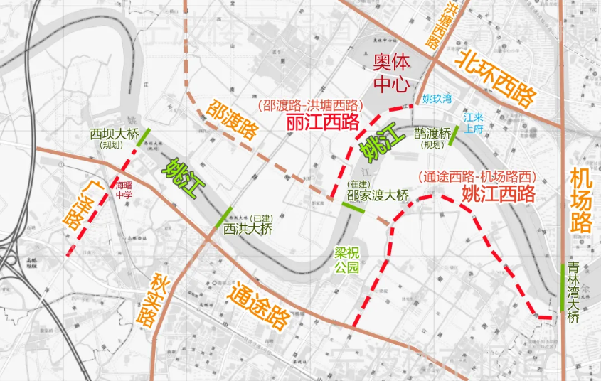 这段丽江路在姚江北岸,西起邵渡路、东至洪塘西路,全长约2公里,即现在姚玖湾南侧的丽江西路往西南延伸,过在建的奥体主体育场后接上在建的邵渡路。