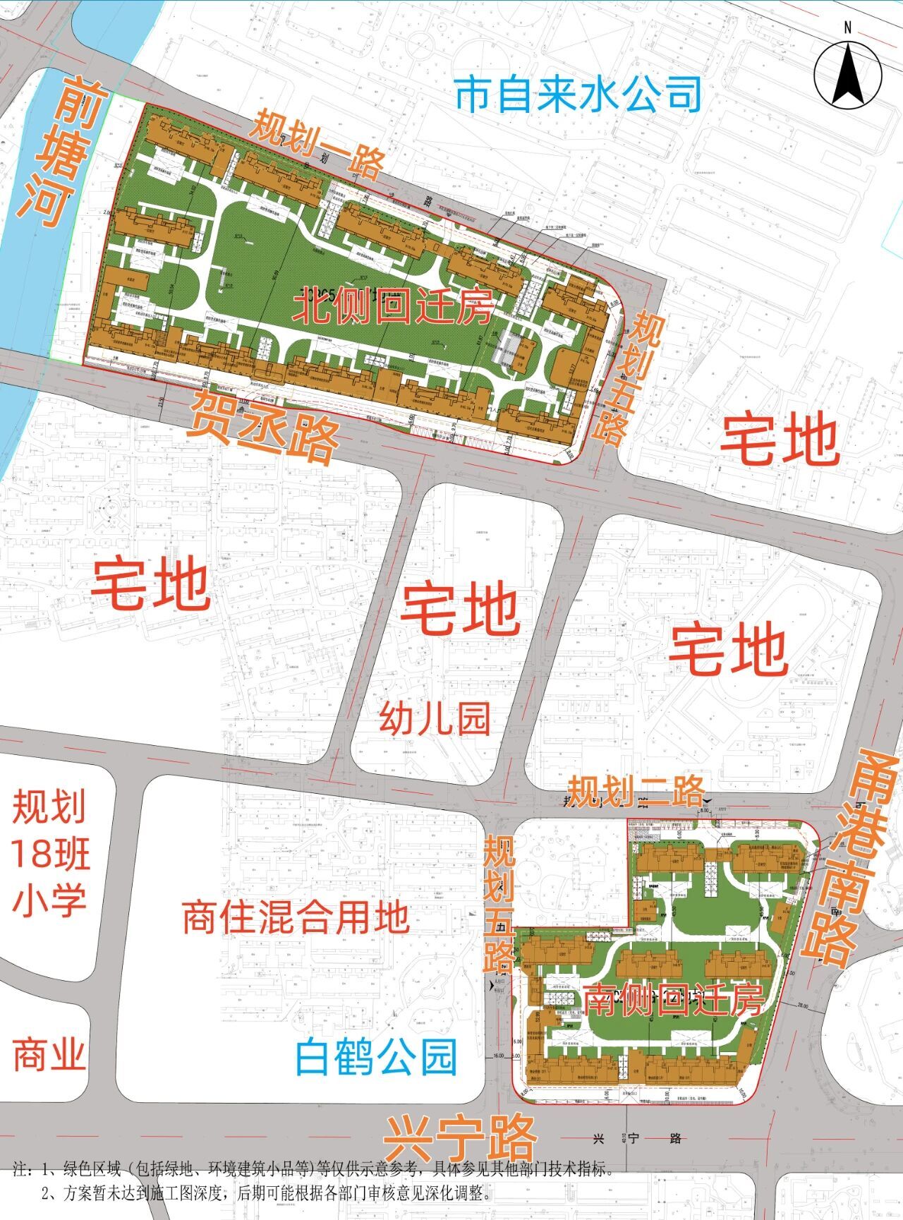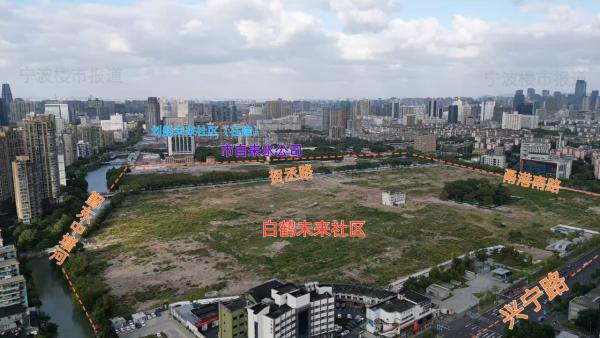 南回迁地块:东临甬港南路,南临兴宁路,西侧是白鹤公园,北侧是规划道路,地块西北角为原悦沁园。
