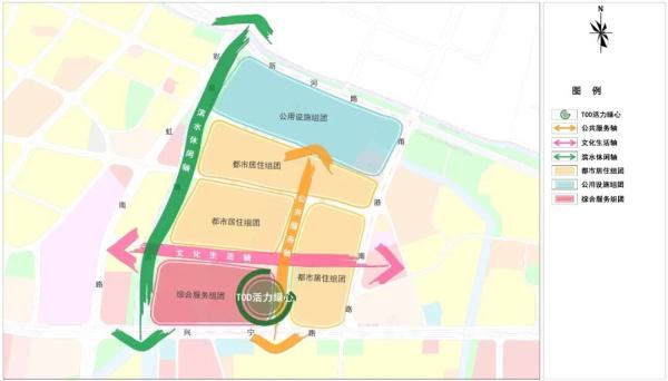 “三轴”:强化白鹤历史文化脉络,打造沿规划二路的文化生活轴;串联轨道交通站点和公共配套,打造沿规划五路的公共服务轴;依托前塘河滨水绿地,打造社区居民休闲游憩的滨水休闲轴。