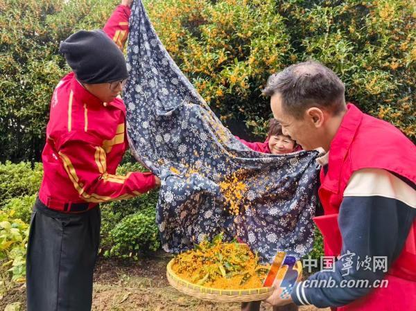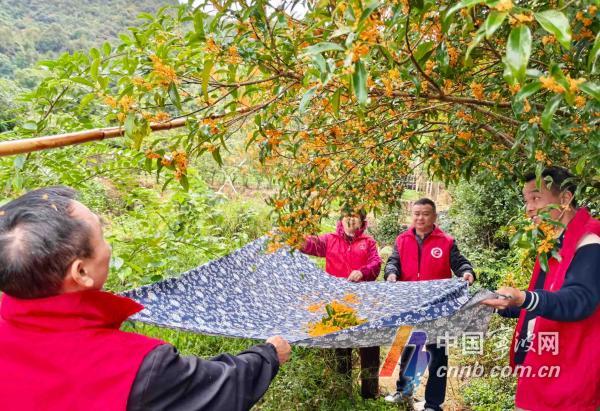 紧急时刻,万景山社区迅速组织起党员志愿者,经过数小时奋战,所有新鲜桂花采收完毕。
