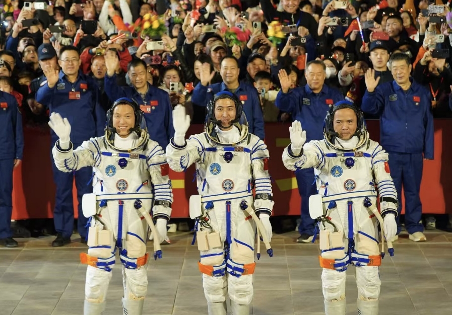 20时49分,张陆、武飞、张洪章3名航天员领命出征。空间站应用与发展阶段飞行任务总指挥部有关成员以及航天科技人员、各族群众代表在现场为航天员乘组壮行。