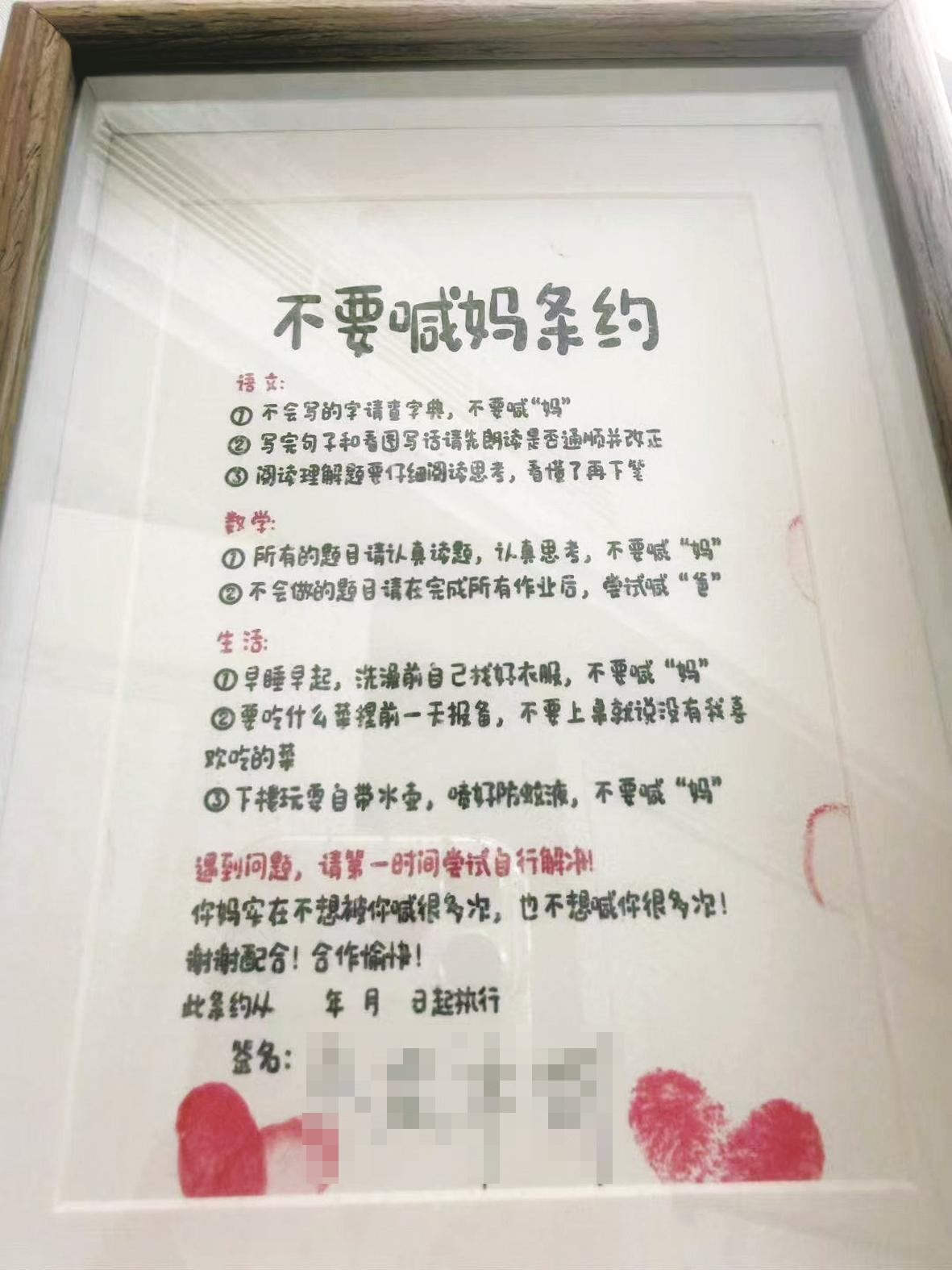 “为了这事,我提前看了不少书,也向身边不少妈妈取了经,做足了功课。”张妈妈回忆,签约那天,儿子还笑嘻嘻地跟她说,不喊妈可以喊“老师、姐姐”来代替啊,但是当两人郑重签下手印,把条约挂在墙上后,一切似乎悄悄变了样。