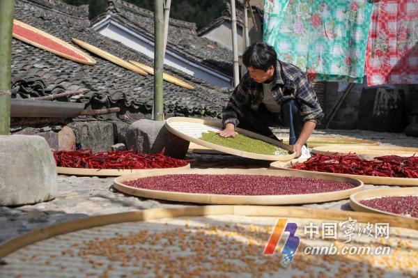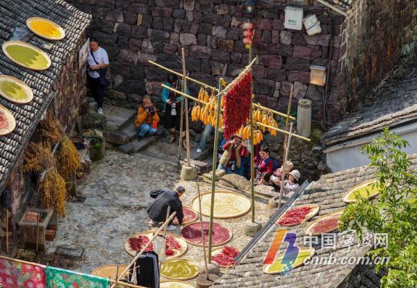 火红的辣椒串、金黄的玉米棒、饱满的红豆与绿豆,与成片的吊红一同在秋阳下铺展。屋檐上垂挂的、竹匾里摊开的各色果实,在阳光浸染下色彩愈发浓郁,空气中弥漫着谷物和果干特有的醇香。村民们在田间地头、房前屋后忙着采摘、分拣、晾晒,欢声笑语伴着秋风在山谷间回荡。