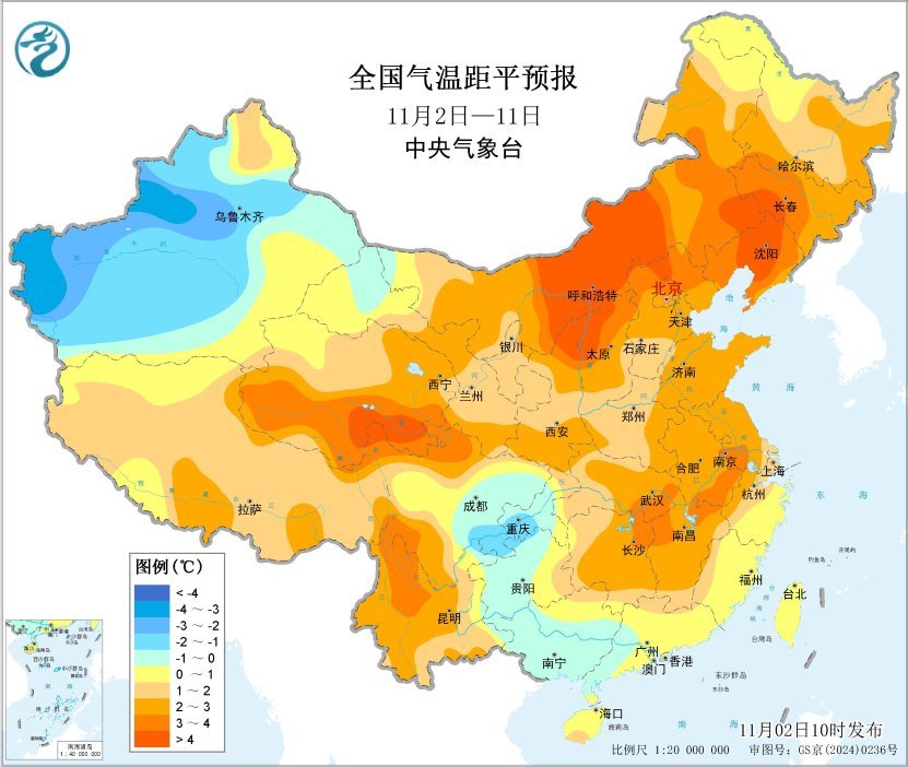 未来十天(11月2日到11日),全国其他大部分地区气温偏高1℃-3℃或接近常年。中央气象台供图