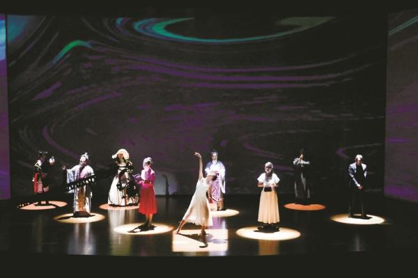 演出还创新启用了巨幅投影幕,将舞台构建成一个可感知的“经典文学意识场域”。现场就像一个供思想穿梭、时空交织的“巨大纸笺”,营造了意蕴深厚的沉浸式对话空间。孔子、苏轼、李清照等中国文化名人,泰戈尔、拉迪亚德·吉卜林等世界文学巨匠仿佛与观众“跨越时空”相遇。