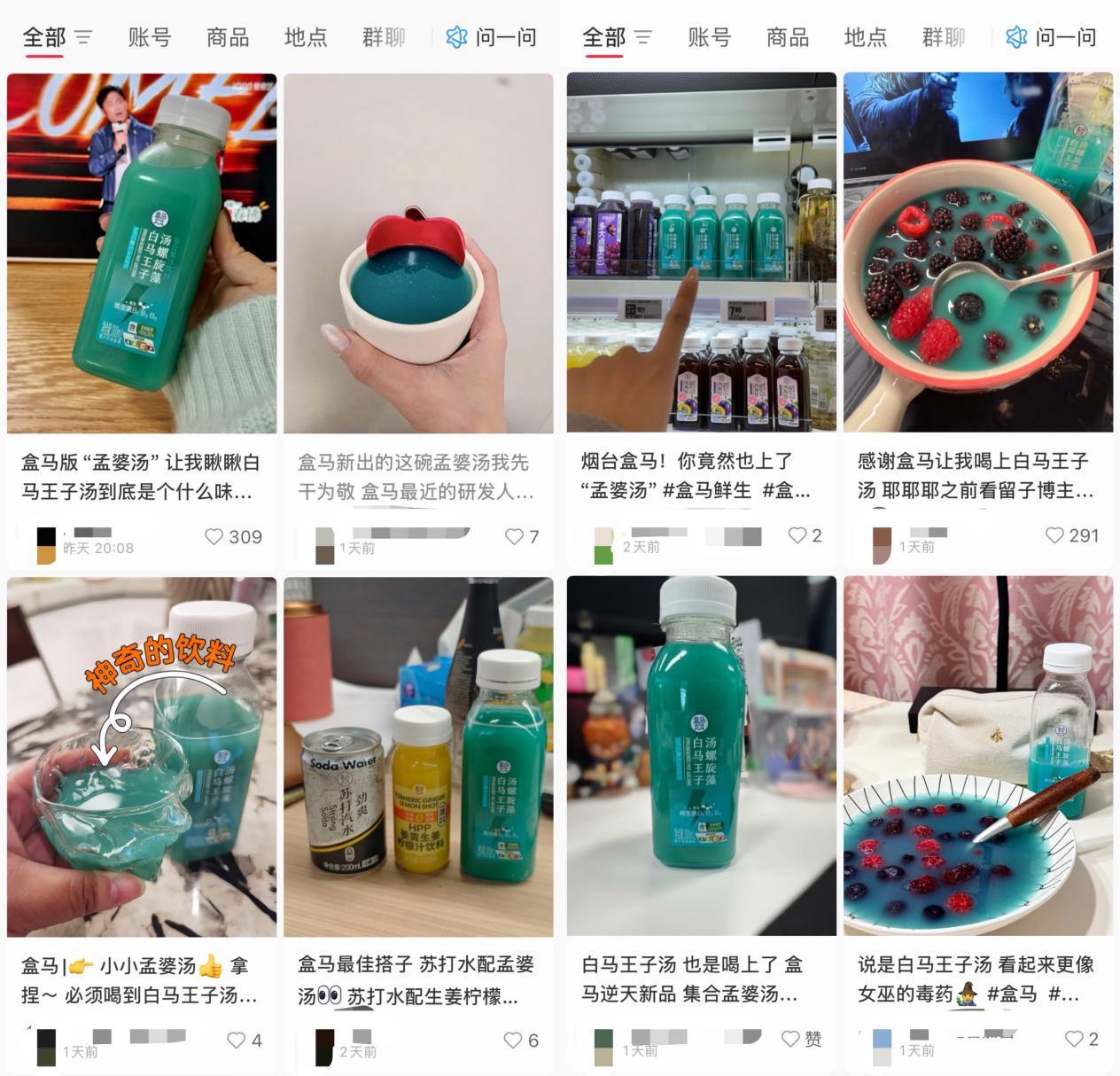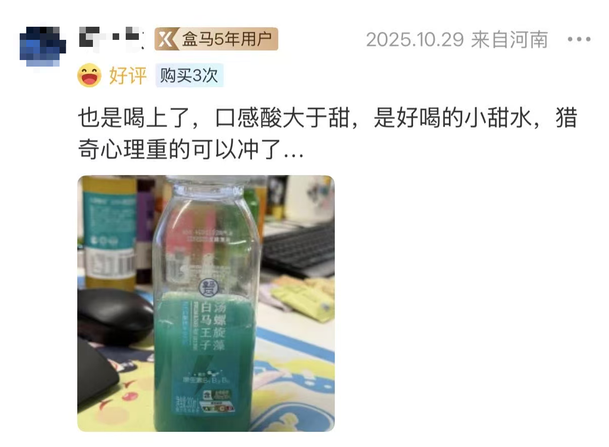 嗅到市场热度后,盒马团队也通过多次改良,推出本土化版本的 “白马王子汤螺旋藻”,聚焦螺旋藻成分和维生素B族,口感上偏向中国网友更爱的果汁风味。