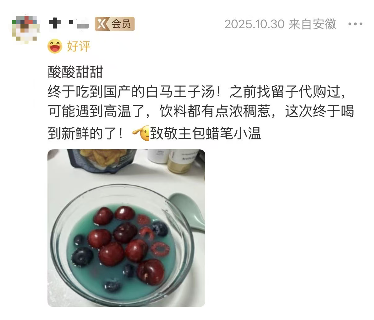 无论是 “晒图吐槽” 还是 “测评尝鲜”,最近,不少网友通过分享与这款 “怪异饮品” 的互动,进一步推动“白马王子汤”的热度发酵。已买到的网友分享体验,“入口居然是酸甜的果汁味”,称 “冷藏后更好喝”,还可以DIY加上苏打水。