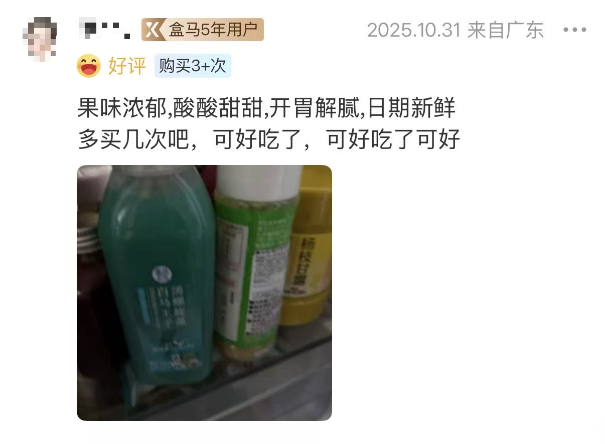 被誉为“噗噗果汁”、“大餐救星”,在HPP冷压榨工艺加持下,盒马西梅汁保留了更多鲜果的风味和营养物质,跃升为果汁圈顶流。