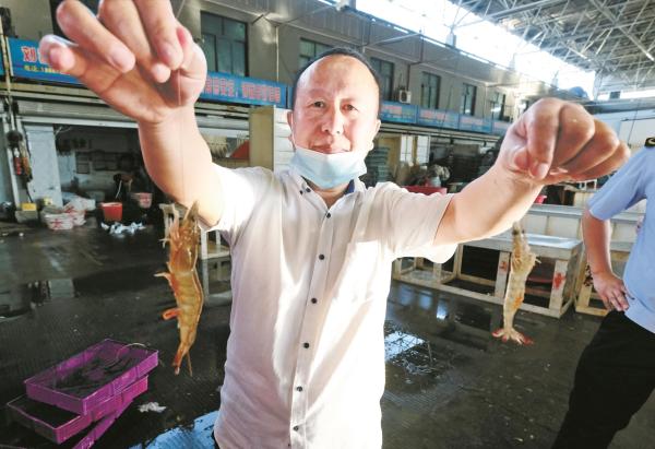 宁波水产品批发市场工作人员展示南美白对虾。(陈结生/摄)