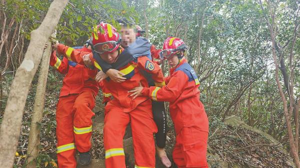 当时,贺先生左脚脚踝肿胀严重,无法活动。消防员当即用医用绷带为其固定。因现场山路狭窄陡峭,不便使用专业救援器材,消防员决定采取人力护送贺先生下山。