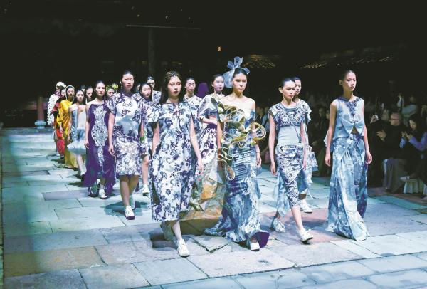 当晚,“古韵新裁·织造镇海”非遗时尚创意作品发布秀举行,30套融合越窑青瓷纹样与英伦剪裁风格的服饰登台,展现传统工艺的现代转化。据悉,相关成果将亮相2025年伦敦时装周“中国设计”专题展区。图为“古韵新裁·织造镇海”非遗时尚创意作品发布秀现场。(宁波日报 甬派客户端 沈莉萍 王国海 张淼 文/摄)