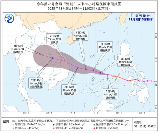 据中央气象台消息,今晨台风“海鸥”已进入南海,未来以每小时20-25公里的速度向西偏北方向移动,强度逐渐加强,最强可达强台风级(42-48米/秒,14-15级),并将于6日夜间在越南中部一带沿海登陆(35-42米/秒,12-14级,台风级或强台风级),之后强度逐渐减弱。中央气象台10时继续发布台风黄色预警。