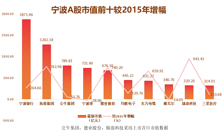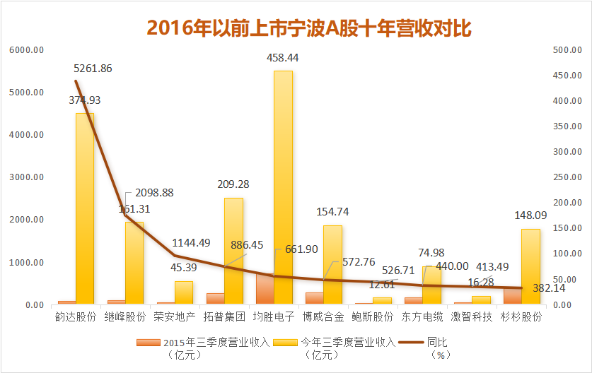 统计显示,在2015年底前上市的49家宁波企业中,营业收入十年翻倍的有33家,韵达股份、继峰股份、荣安地产等均增长超10倍;归母净利润10年倍增的有19家,东方电缆、韵达股份、博威合金等均增长超10倍。