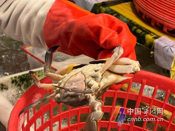 大世界水产交易区另一侧,甬海活鲜行内的精品红膏蟹快被售空了,老板勒鑫将一筐子母蟹提溜起来,梭子蟹张牙舞爪,看起来很鲜活。从昨晚7点到今早10点,该店销量超500公斤。