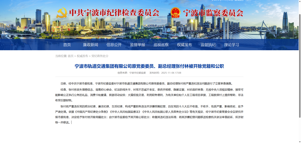 日前,经中共宁波市委批准,宁波市纪委监委对宁波市轨道交通集团有限公司原党委委员、副总经理张付林严重违纪违法问题进行了立案审查调查。