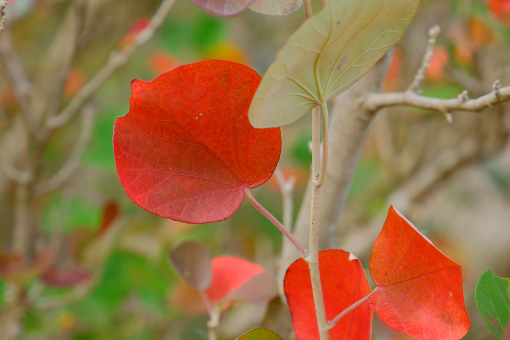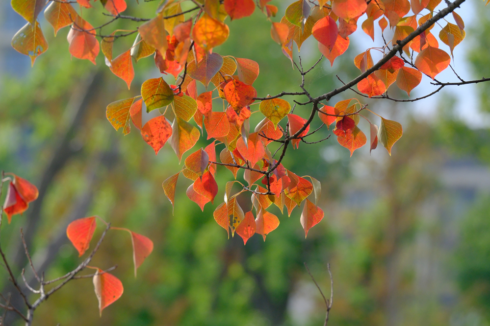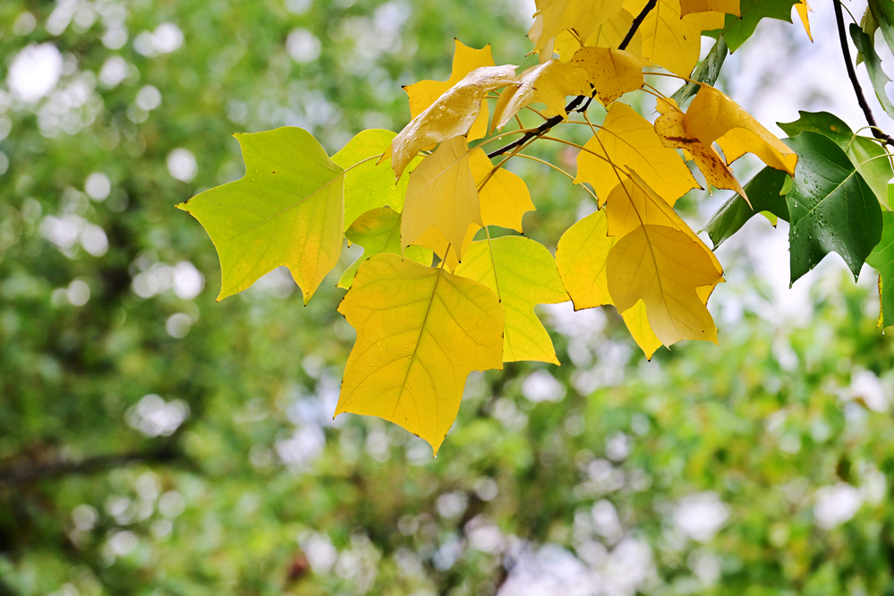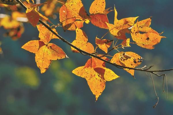 枫香与乌桕也是极美的观叶树种,在宁波城乡各地均可见到。它们的秋叶由绿慢慢转黄,然后再变为深红,色彩层次特别丰富。有时在同一棵树上可看到绿、黄、橙、红等等多种颜色。