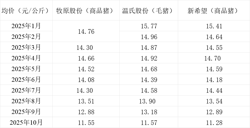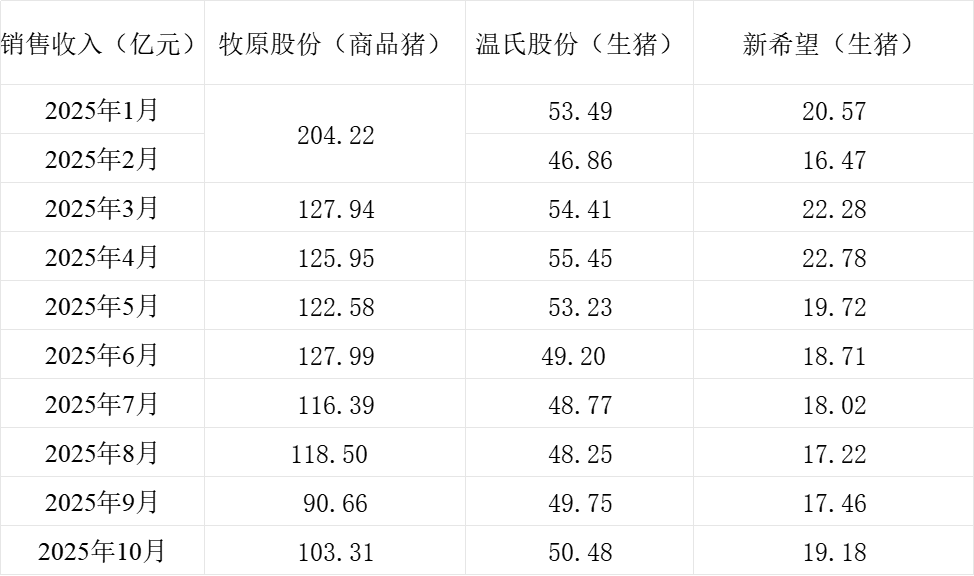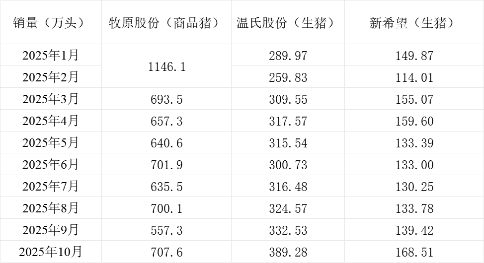 三大上市猪企牧原股份(002714.SZ)、新希望(000876.SZ)、温氏股份(300498.SZ)近日发布2025年10月生猪销售情况。