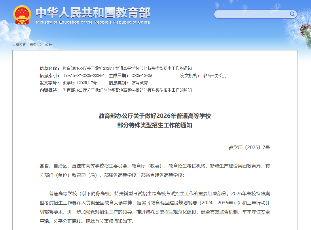《2026年普通高等学校部分特殊类型招生基本要求》 图源教育部网站