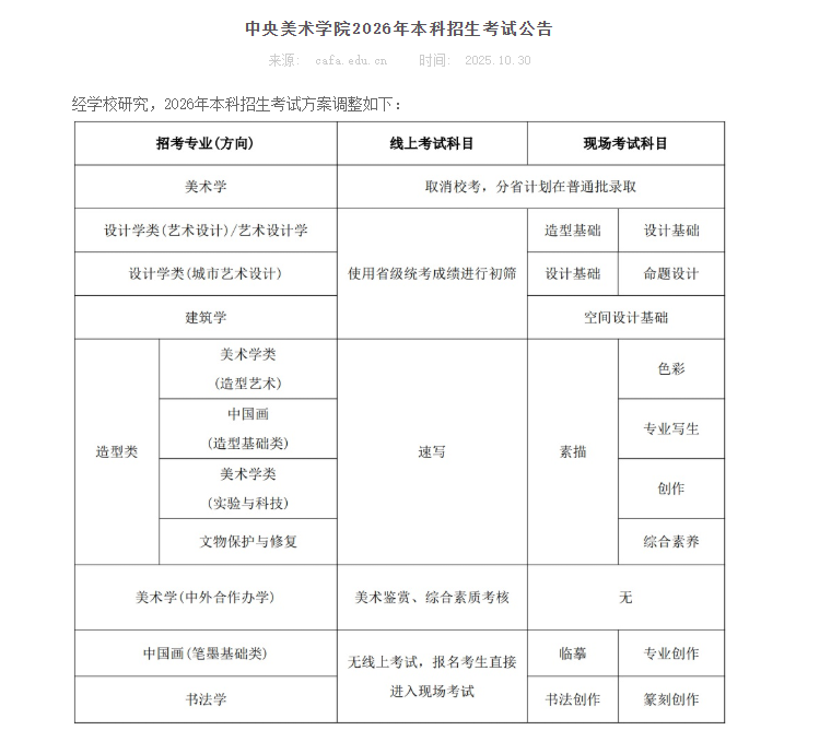 《要求》发布后的第二天,中央美术学院发布《2026年本科招生考试公告》,宣布美术学专业取消校考,分省计划在普通批次录取;设计学类(艺术设计)/艺术设计学、设计学类(城市艺术设计)、建筑学均使用省级统考成绩进行初筛,不再组织线上考试。