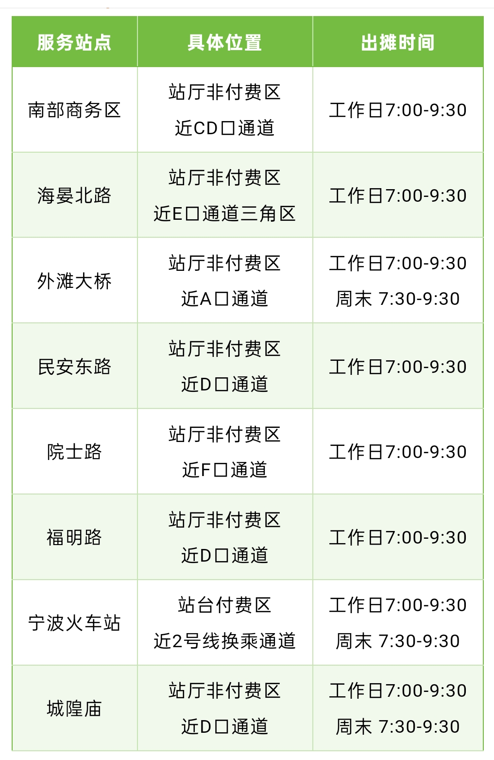 外滩大桥、宁波火车站、城隍庙等3个站点在周末同步开放,服务时间调整为7:30-9:30。