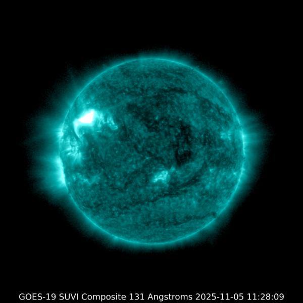 △图中圆盘区域为131埃波段下的太阳,左侧偏上的白色高亮区域就是太阳耀斑(图源:空间天气)