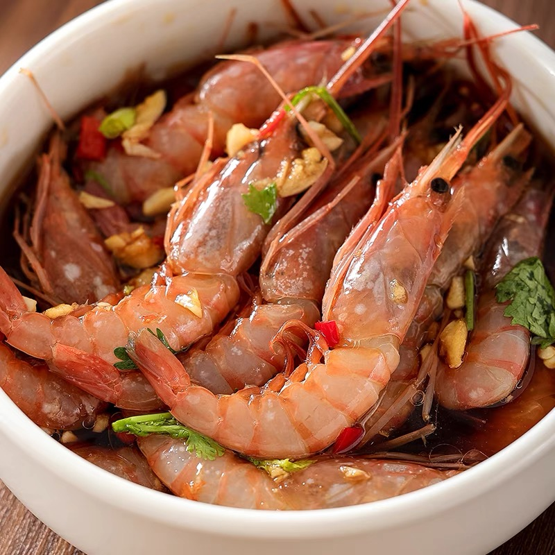 “潮汕生腌”做法。象山东海红虾制作,只只饱满、壳薄肉肥。