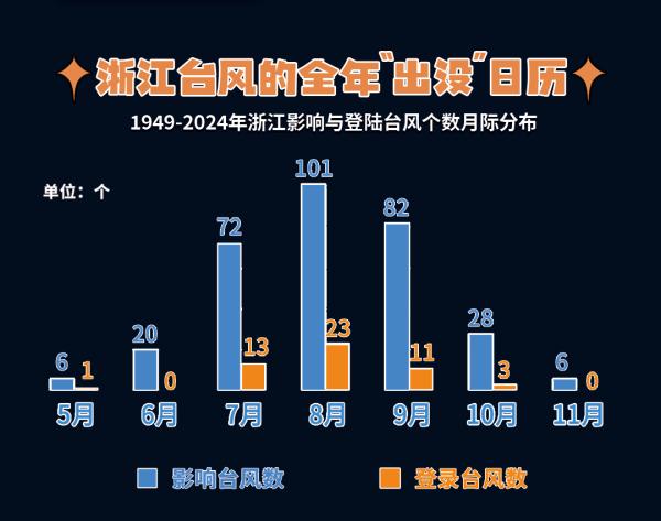 根据浙江省气象服务中心(1949年-2024年)的数据统计显示,历史上11月份对浙江有影响的台风个数为6个,直接登陆的个数为0个。这表明11月台风影响浙江虽属小概率事件,但绝非没有先例,且其带来的风雨影响不容小觑。