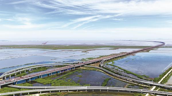 在宁波前湾新区西北侧的杭州湾海域,“双桥对话”正精彩上演。
