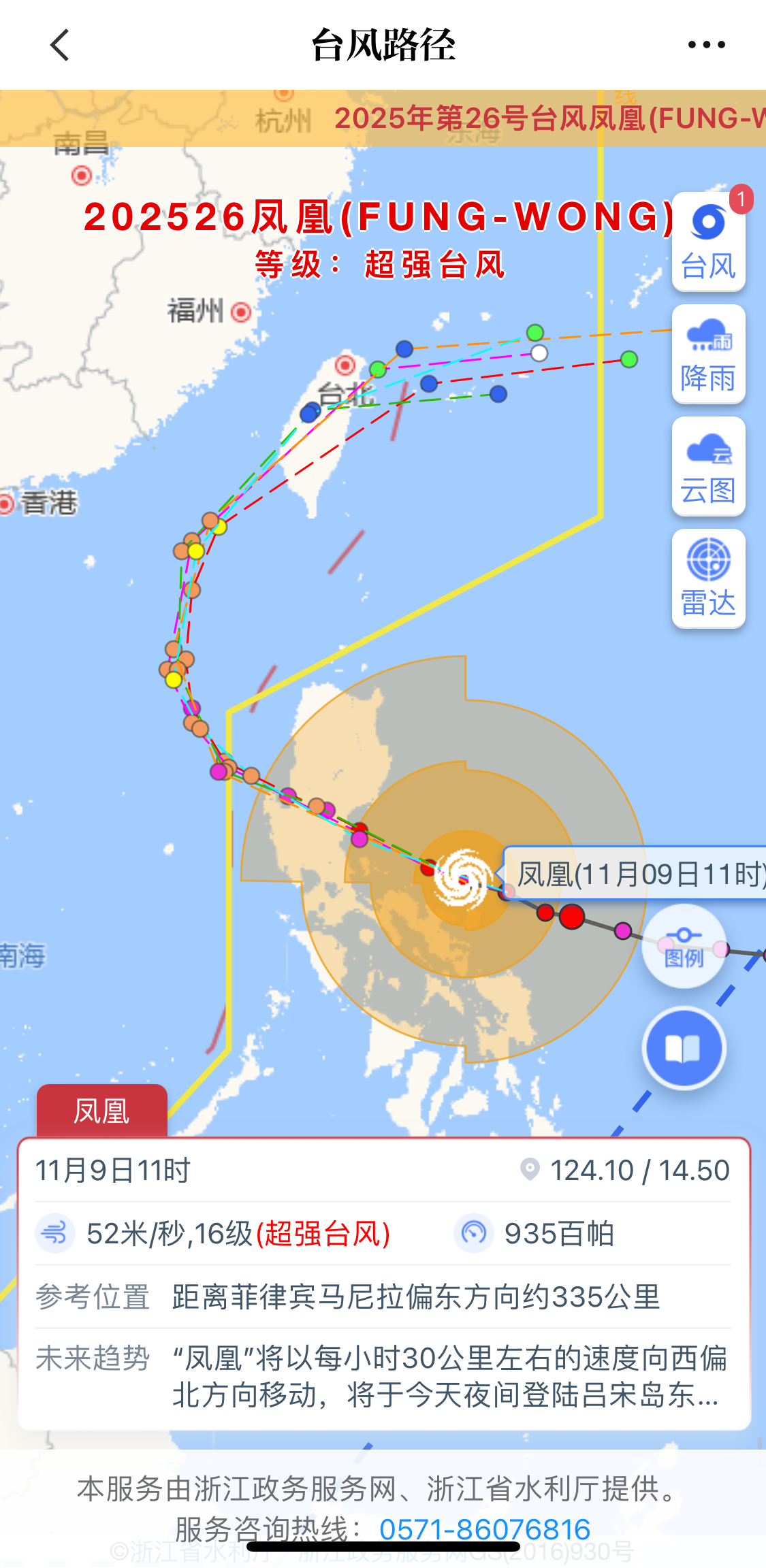截至11月9日11时,今年第26号台风“凤凰”位于距离菲律宾马尼拉偏东方向约335公里的洋面上,近中心最大风力16级(52米/秒,超强台风),七级风圈半径380-520公里,十级风圈半径220-280公里,十二级风圈半径100-120公里。