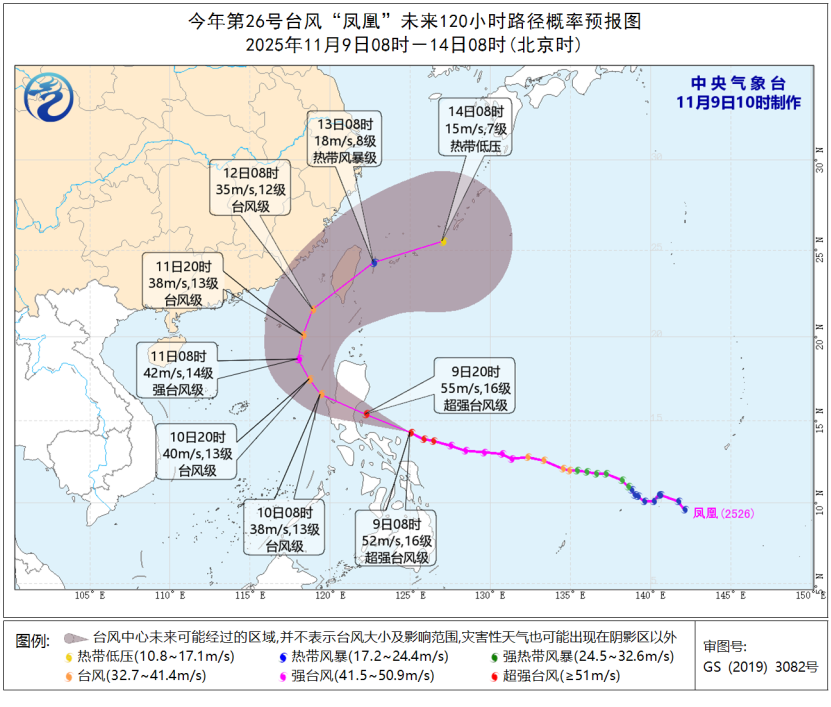 中央气象台在11月9日10时发布的公报中提到,“凤凰”预计会在11月10日中午前后移入南海东部海面,11月11日开始逐渐转向北偏东方向移动,趋向台湾岛南部沿海,强度快速减弱。