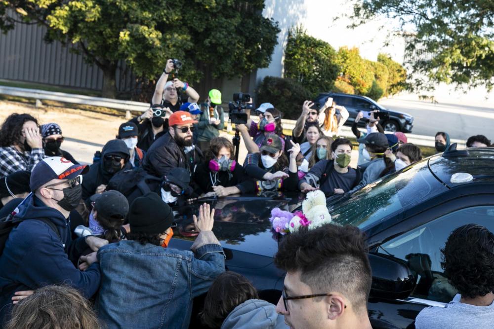 9月26日,在位于美国芝加哥西郊布罗德维尤市,抗议者阻止移民与海关执法局的车辆驶入办公机构。新华社发(文森特·约翰逊摄)