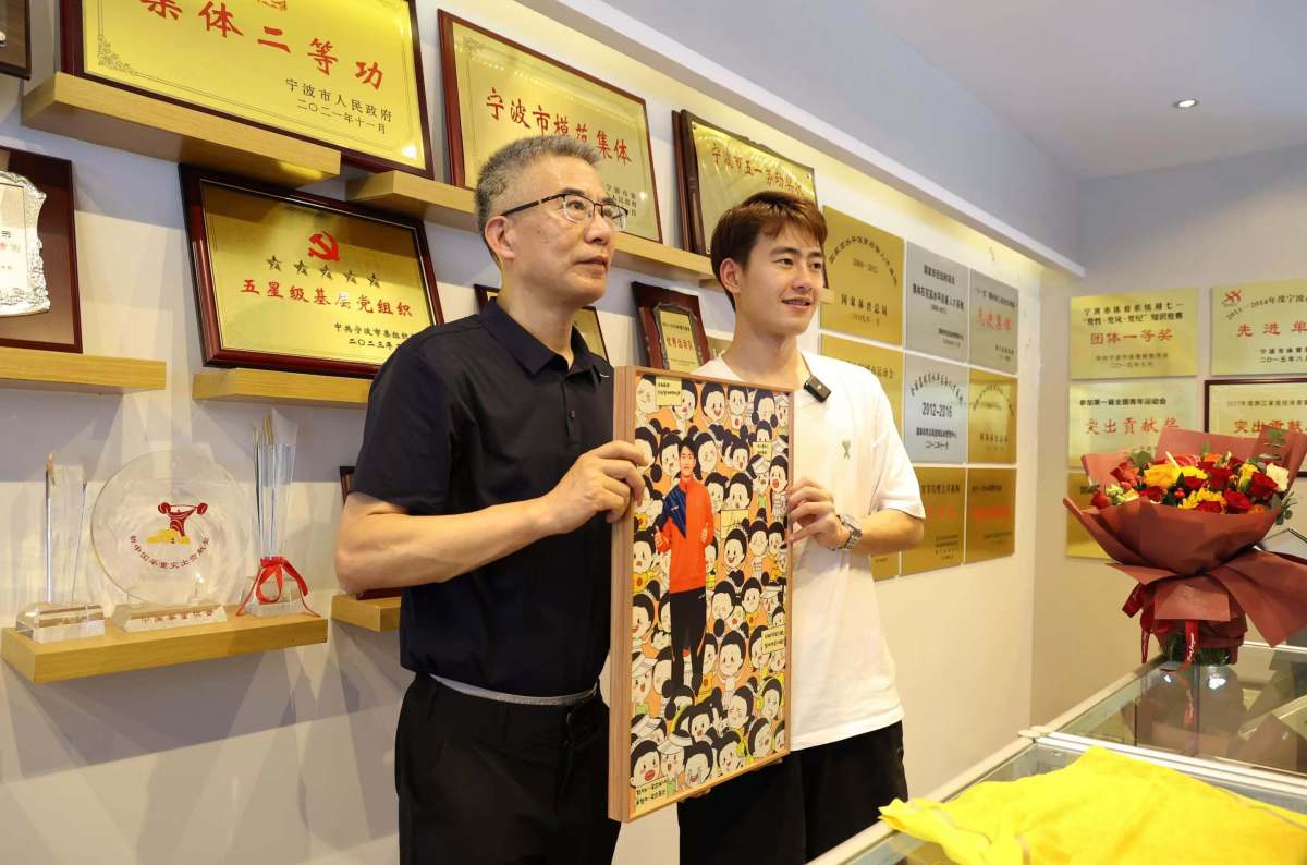 王昶(右)在巴黎奥运会后回母校时与宁波体育运动学校党总支书记顾飞舟合影。资料图