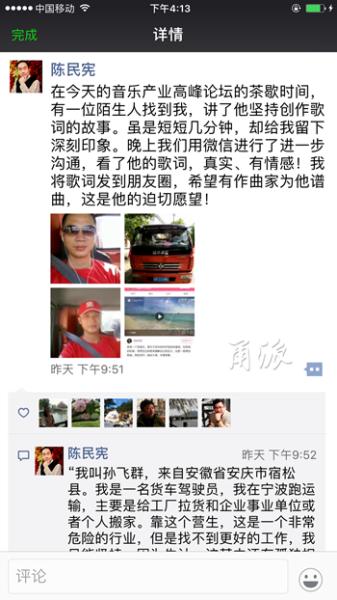 当天晚上,孙飞群便收到了陈民宪的消息:“你的词有生活的重量,希望它们能插上音乐的翅膀。”不仅如此,陈民宪还发了一条朋友圈,马上为谱曲的事情“张罗”起来:“……看了他(孙飞群)的歌词,真实、有情感!我将歌词发到朋友圈,希望有作曲家为他谱曲,这是他的迫切愿望!”
