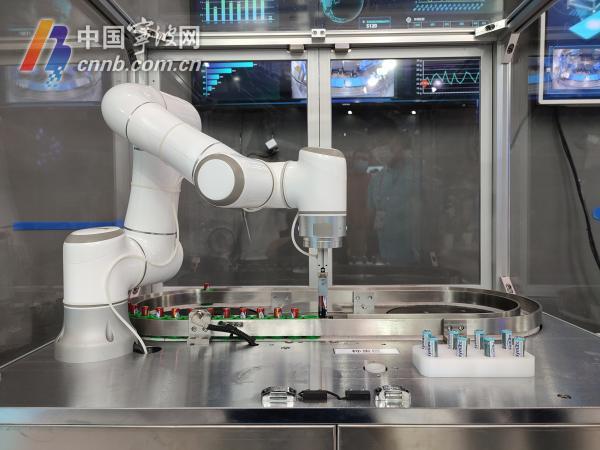 野马电池的机械手正为电池称重