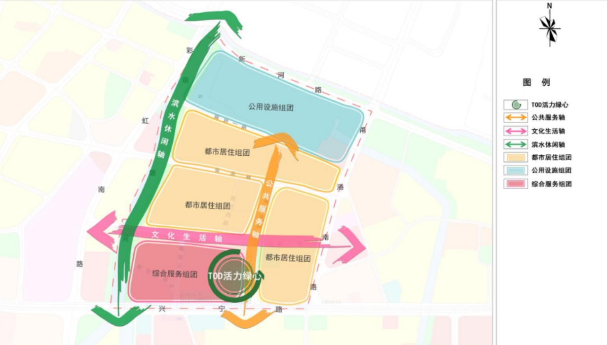 “三轴”:强化白鹤历史文化脉络,打造沿规划二路的文化生活轴;串联轨道交通站点和公共配套,打造沿规划五路的公共服务轴;依托前塘河滨水绿地,打造社区居民休闲游憩的滨水休闲轴。