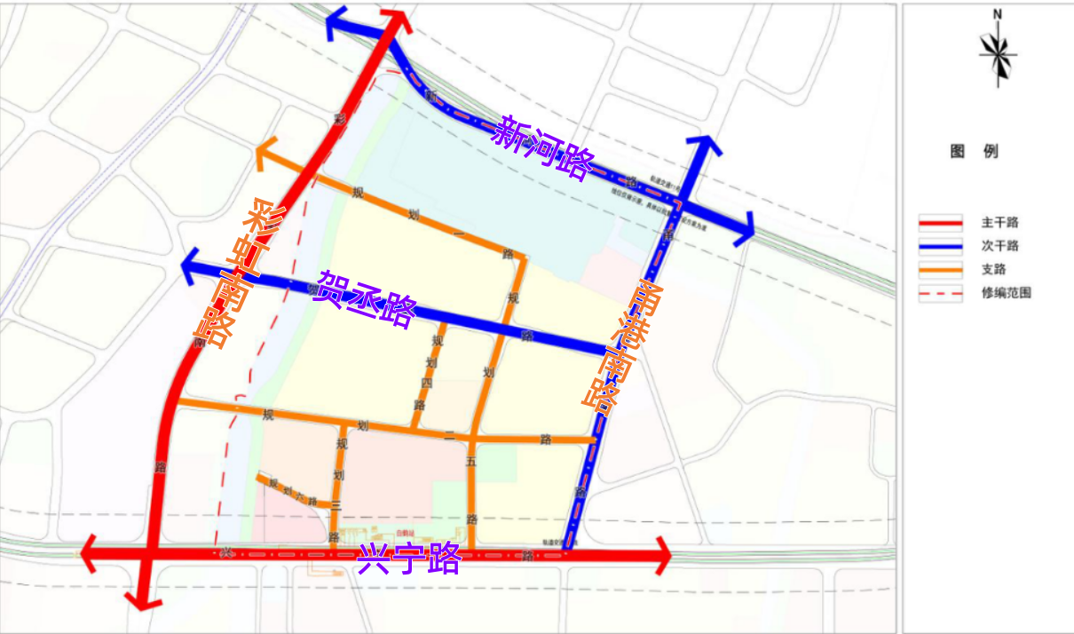 整个街区的路网,也与原先有较明显的不同。街区规划形成“三横两纵”路网骨架,其中“三横”为新河路、贺丞路、兴宁路,“两纵”为彩虹南路、甬港南路,内部则新建6条规划路。
