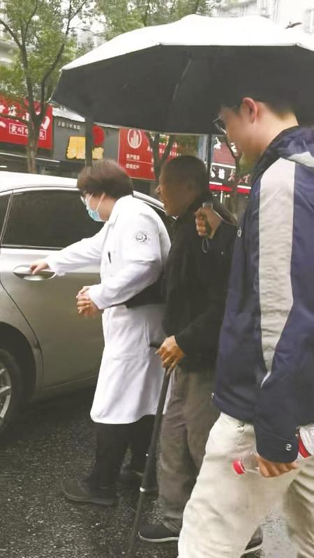 做好血透后,九院血液净化中心主任厉旭光把老人扶下楼送上出租车。