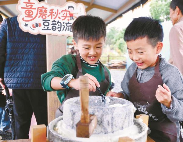 课堂不仅延伸到远方的博物馆,更扎根在身边的田野与工坊。奉化剡水田园智创农园里,10余户亲子家庭围着农技员,看无人机如何精准施肥;北仑春晓街道的活动现场,“液氮薯片”的仙气还未散去,孩子们又转到豆腐工坊,跟着老师转动石磨,看黄豆在水中变成豆浆,再凝结成豆腐。“以前觉得‘粒粒皆辛苦’是口号,现在磨完豆腐才知道,每样食物都来之不易。”参与活动的学生小周说。