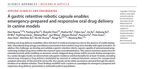 近日,国际期刊《Science Advances》(《科学进展》)发表了来自浙江大学药学院南科望研究员团队的一篇论文,其中的主要研究成果是:一种能够在胃内长期驻留(比格犬体内至少10周)的“胃驻留机器人胶囊”,可以通过手机蓝牙等方式,在需要时,实现药物的快速精准投递。