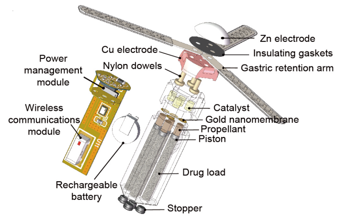 他表示,与普通胶囊吃下就随消化排出不同,该胶囊进入胃后,内置的镍钛合金支架会展开,并停留在胃里,不被排出体外。一个胶囊内包含四个药仓,可以控制四次药物释放。