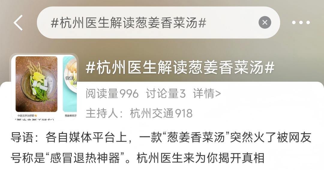 日前,在社交媒体上,“葱姜香菜汤”的热度很高。这款被网友称为“感冒退热神器”的美味,所用食材简单,仅需三片生姜、五段葱白、七颗香菜梗,做法也省事,冷水下锅,煮开放入红糖后关火即可,还讲究“趁热猛喝”,试过的人纷纷留言“喝完整个人通透了”“低烧真的退了”。