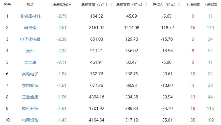 板块方面,燃气、医药商业、油气开采及服务、厨卫电器等涨幅居前,非金属材料、半导体、电子化学品、元件等跌幅居前。