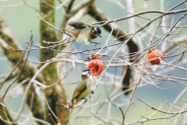 每年这个时候,无数红彤彤的柿子挂在枝头,引来很多雀鸟啄食,白头鹎就是这些食客中为数最多的一种鸟。图为在镇海九龙湖镇横溪村拍到的白头鹎吃柿子场景。(甬派客户端宁波日报 张海华 摄)